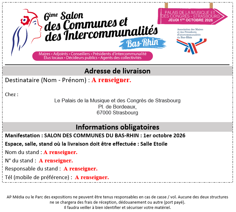 AP Média ou le Parc des expositions ne peuvent être tenus responsables en cas de casse / vol. Aucune des deux structures ne se chargera des frais de réception, dédouanement ou autre (port payé). Il faudra veiller à bien identifier et sécuriser votre matériel.